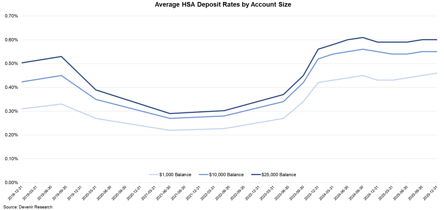 The Federal Reserve reduced rates three times in 2025 with two of those cuts occurring in the fourth quarter. The Effective Federal Funds Rate (EFFR) is now at 3.64%1, which remains lower than the long-term median value between July 1954 to present of 4.33%. However, it is still elevated compared to pre-2022 levels before the Federal Reserve’s rate hiking cycle began. Although the Fed cut rates twice last quarter, upward movement suggests that providers want to continue their commitment to attracting and retaining account holders through competitive interest offerings. The spread between the rates offered for $1,000 and $25,000 balance tiers is 14 basis points. This gap has narrowed by 2 basis points over the last year.